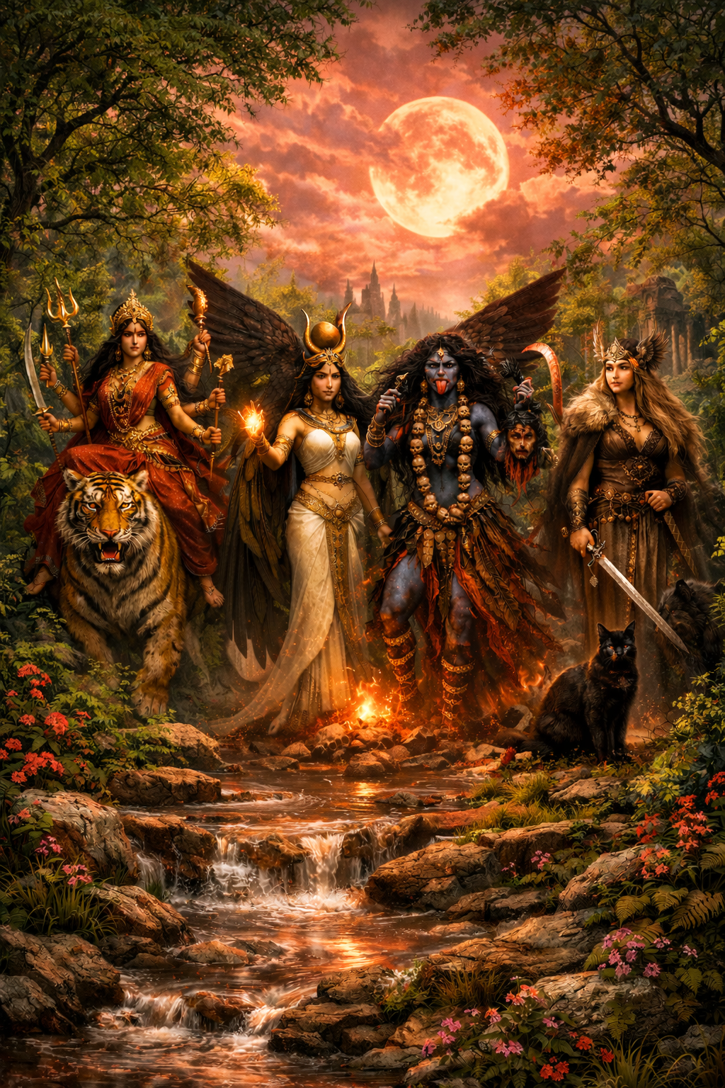 Wij werken met Durga, Isis, Kali en Freyja omdat zij samen het volledige vrouwelijke spectrum vertegenwoordigen: bescherming, intuïtie, transformatie en belichaming. Wanneer één van deze lagen ontbreekt, blijft kracht onvolledig.